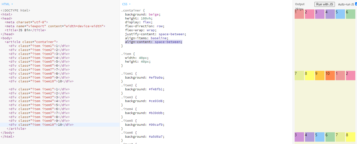 justify-content: space-around 일 시, 1번째 10번째 는 1개분량 정도만 띄어져있다