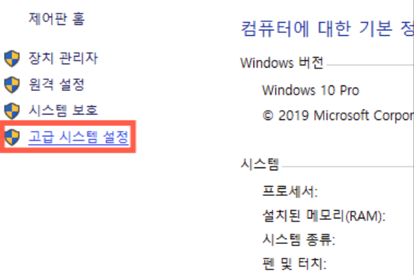 설정 창이 뜨면 좌측의 고급 시스템 설정을 선택합니다.