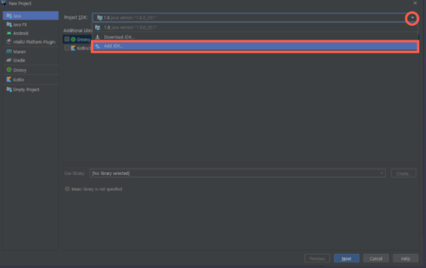오른쪽 위에 Project SDK를 선택하는 빨간 원 안의 버튼을 누른 후 ADD JDK 를 선택합니다.