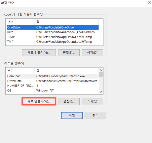 환경 변수 창이 뜨면 시스템 변수(S) 영역에 새로 만들기(W)...를 누릅니다.