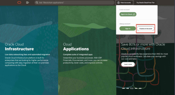 https://www.oracle.com/index.html 로 들어가서 빨간 박스 안의 Create an Account 를 누릅니다.