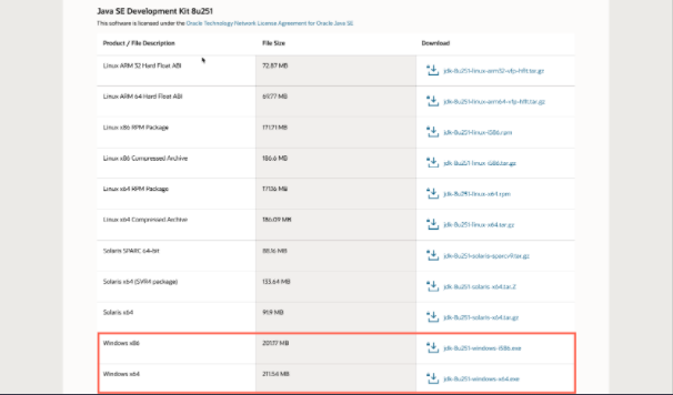 https://www.oracle.com/kr/java/technologies/javase/javase-jdk8-downloads.html 을 통해 다운로드 페이지로 이동합니다. 이동 후 32bit 윈도우를 사용중이시라면 Windows x86을, 64bit 윈도우를 사용중이시라면 Windows x64를 받아주세요.