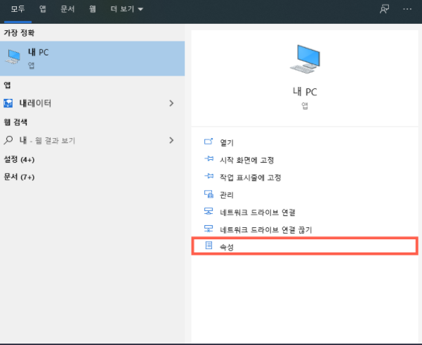 방금 설치한 Java를 OS 전반적으로 사용하기 위해 설치된 경로를 저장하는 과정입니다. 내 PC에서 마우스 오른쪽 버튼을 누르고 속성 을 선택합니다.