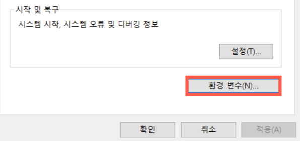 창이 뜨면 고급 탭을 선택하고, 가장 아래의 환경 변수(N)...를 누릅니다.