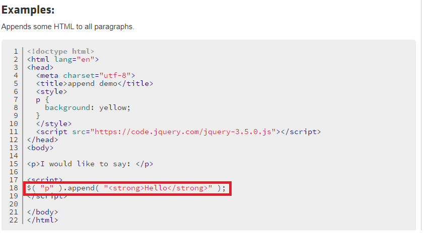 $( "p" ).append( "<strong>Hello</strong>" );
