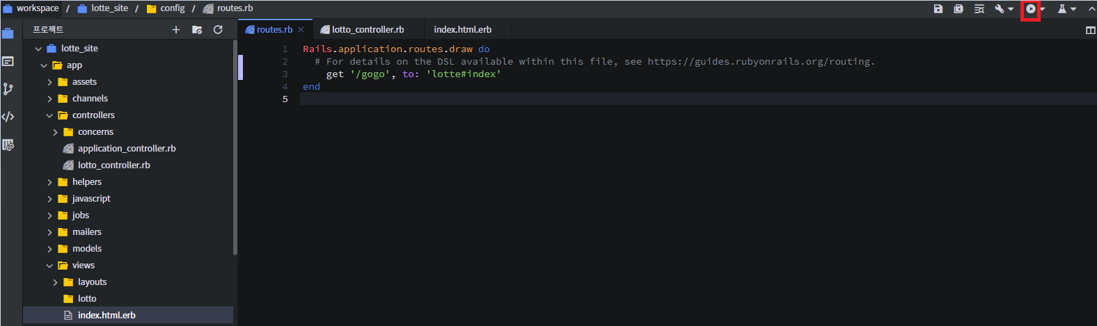 두번째 따옴표는 controller#view 적어주고 실행한다.